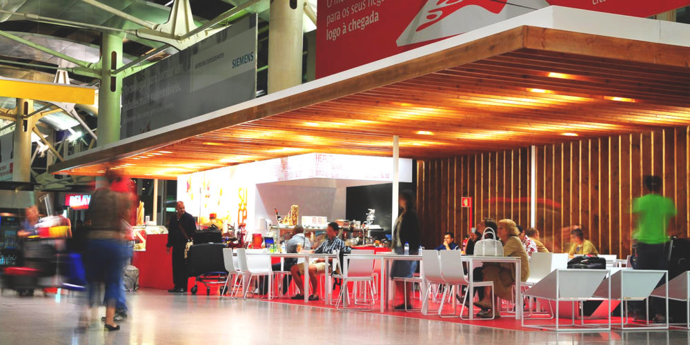 Esta intervenção consistiu na elaboração e construção de uma cafetaria, de forma a criar um ambiente que se adeque á imagem da marca em questão e o cenário onde se insere, a zona de chegada do aeroporto de Lisboa.
